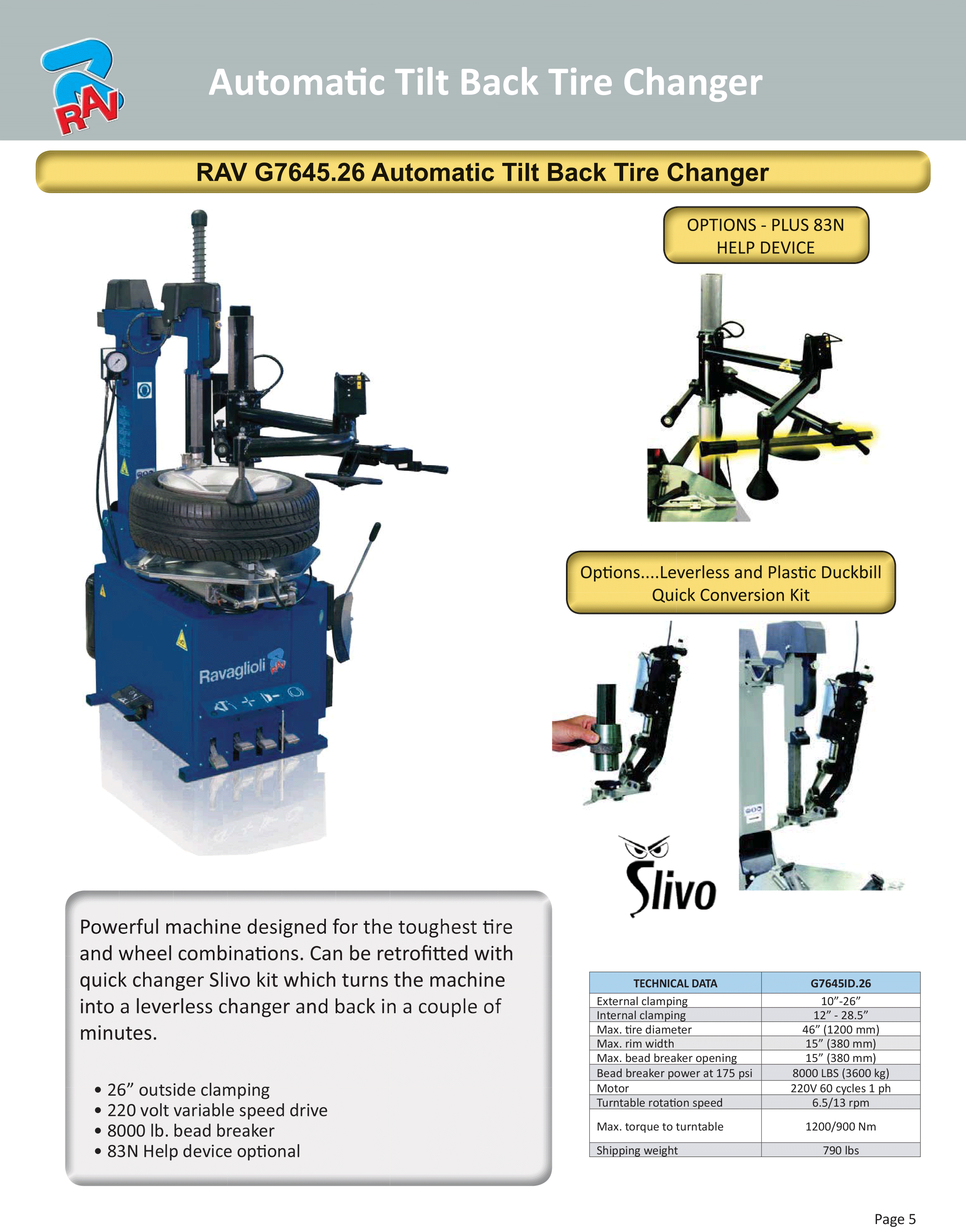 The extra height of the vertical post and tool shaft allow operation on tires to a maximum of 17” (431 mm) width. Features of the G7645 Automatic Tilt Back Tire Changer include: