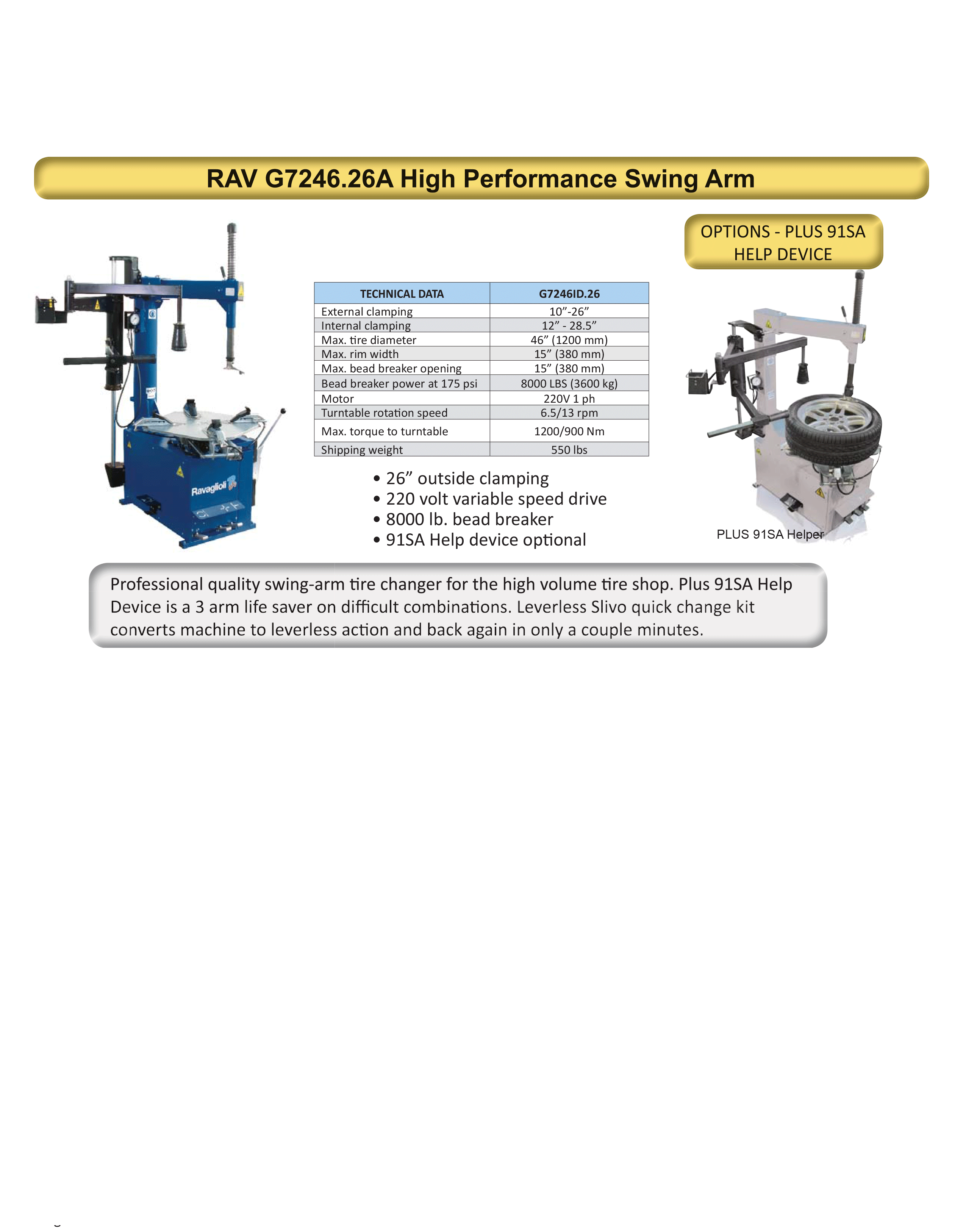 The G7246.26A High Performance Swing Arm Changer is a fast performing swing arm tire changer for the high volume tire center and is often equipped with the optional Helper Arm 91SA. Exclusive 220v drive motor provides needed torque for handling today’s difficult assemblies. True variable speed control allows operator to match turntable rotational speed with the job at hand. The frame is large and reinforced to grant the utmost rigidity to the structure and chucking table. The gear box is installed between two steel plates to avoid flexing during operation. The extra height of the vertical post and tool shaft allow operation on tires to a maximum of 15” (381 mm) width. We at AETechnologies have supplied this machine to shops that mount and demount Skidsteer tires. Features of the G7246.26A include: